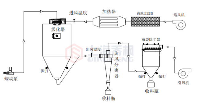 空氣經過過濾和加熱,進入干燥器頂部的空氣分配器,熱空氣螺旋均勻地進入干燥室。材料液通過塔頂部的高速離心霧化器(旋轉)噴射成非常微妙的霧珠,并在很短的時間內與熱空氣和流接觸。成品由干燥塔底部和旋風分離器連續輸出,廢氣由引風機排出。